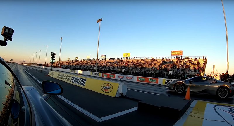 Τα στοιχεία αυτά κάνουν συγκρίσιμα τα δύο οχήματα σε ό,τι αφορά το ποιο είναι ταχύτερο από τα δύο, τελικά, στην επιτάχυνση από στάση. Αυτό προσπάθησαν να διαπιστώσουν οι συντελεστές του διαδικτυακού καναλιού «DragTimes» οι οποίοι διοργάνωσαν έναν αγώνα dragster μεταξύ της SF90 Stradale και της 765LT για το ποια θα σταματήσει πρώτη τον χρόνο στη διαδικασία επιτάχυνσης ¼ μιλίου (0-402 m).