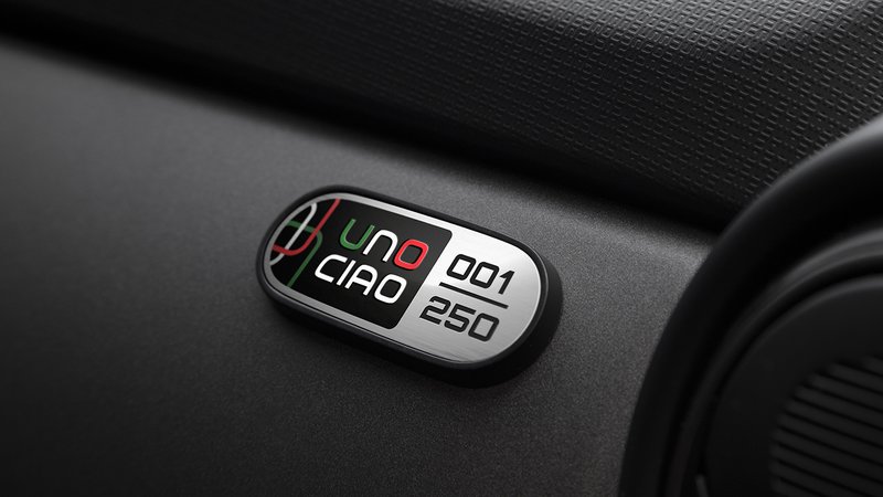 Αν περάσουμε στο εσωτερικό του Uno Ciao θα δούμε τις αποκλειστικές διακοσμητικές επενδύσεις στις πόρτες και το ταμπλό, όπως και την ειδική για αυτή την έκδοση επένδυση των καθισμάτων. Το πλέον εντυπωσιακό στοιχείο είναι το μικρό ταμπελάκι με τον αριθμό του αυτοκινήτου στο δεξί μέρος του ταμπλό.
