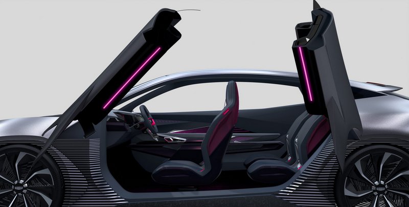 Οι μεσαίες κολώνες απουσιάζουν εντελώς και αυτό επιτρέπει την πρωτοποριακή μηχανική σχεδίαση των 4 θυρών. Οι πόρτες ανοίγουν αντικριστά η μία προς την άλλη, αλλά και προς τα πάνω. Αποκαλύπτουν με αυτό τον τρόπο ένα 2 2 θέσεων εσωτερικό, με φουτουριστικό διάκοσμο που φωτίζεται από πολλά και διαφορετικά LED στοιχεία. Τα LED στο ταμπλό μοιάζουν να ρέουν στον ψηφιακό πίνακα οργάνων. Τα βλέμματα τραβά τόσο το φωτιζόμενο πολυγωνικό τιμόνι με τα χειριστήρια τεχνητής νοημοσύνης, όσο και η κάθετη αλά tablet οθόνη στην κεντρική κονσόλα.