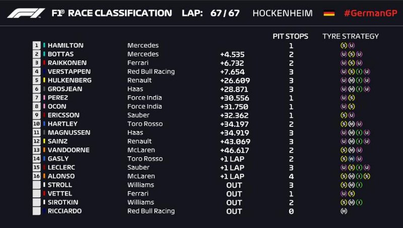 Σε αγώνα θρίλερ εξελίχθηκε το φετινό Γκραν Πρι στο Hockenheim, όταν η βροχή που ξεκίνησε να πέφτει μετά το μέσο του αγώνα έφερε αρκετο δράμα, σε ένα μέχρι τότε ήσυχο απόγευμα. Η βροχή ξεκίνησε μετά τον 40ο γύρο και έπεφτε αρχικά σε κάποιες από τις στροφές της πίστας (!) μην επιτρέποντας στις ομάδες να ακολουθήσουν μία ξεκάθαρη στρατηγική με τα ελαστικά.