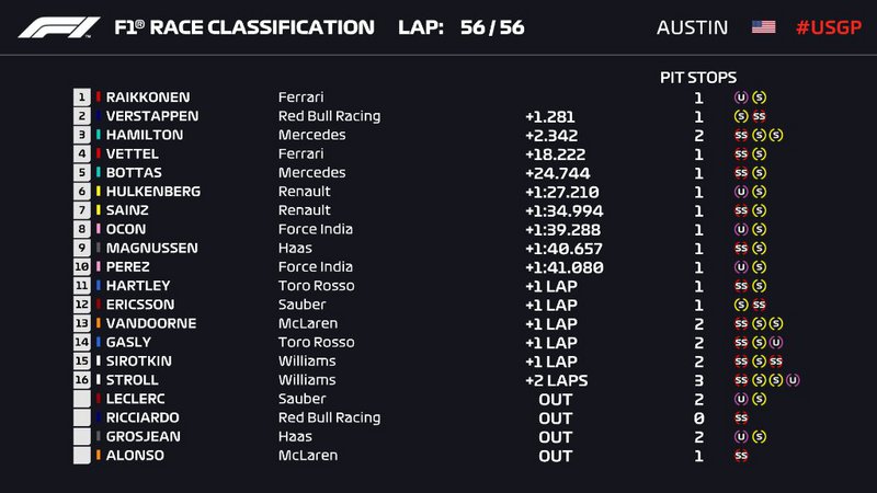 Και εκεί που όλα έδειχναν ότι σήμερα θα είχαμε πρωταθλητή, τελικά ένας Kimi Raikkonen από τα παλιά, κατάφερε να πάρει τη νίκη, και σε συνδυασμό με τους υπόλοιπους τερματισμούς να αναβάλει την ανάδειξη του πρωταθλητή για τον επόμενο αγώνα στο Μεξικό.