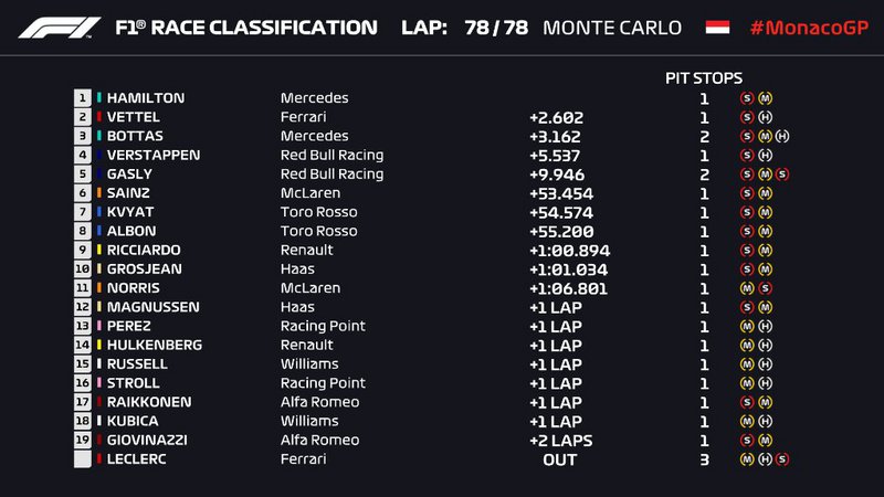 Στο Μονακό οι Mercedes βρέθηκαν να απειλούνται και να έχουν έντονο ανταγωνισμό, σε έναν αγώνα που εξελίχθηκε μέσα σε κινήσεις τακτικής και επιλογές ελαστικών. Τελικά παρά το ότι ο Hamilton οδηγούσε για πάρα πολλούς γύρους παραπονούμενος για την κατάσταση των ελαστικών του, κατάφερε να τερματίσει στην πρώτη θέση, κρατώντας πίσω του έναν Verstappen που πίεζε σε όλη την διάρκεια του αγώνα. O Βρετανός μάλιστα παραδέχτηκε ότι ήταν ένας από τους δυσκολότερους αγώνες της καριέρας του.