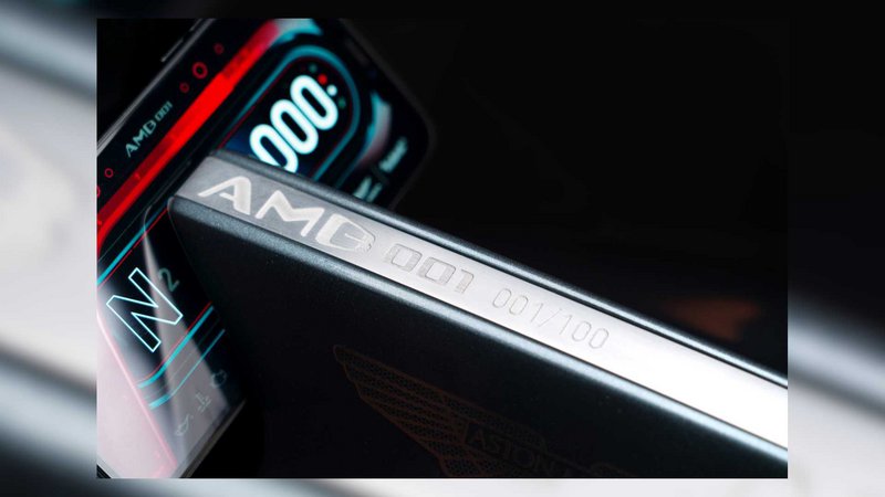 Με βάρος 180 κιλών και έναν υπερτροφοδοτούμενο V2 κινητήρα απόδοσης 180 ίππων, η AMB 001 τιμά το έμβλημα της Aston Martin που έχει χαραχθεί στις επιφάνειές της, χωρίς παρόλα αυτά να ανακοινώνονται οι υπόλοιπες προδιαγραφές της.