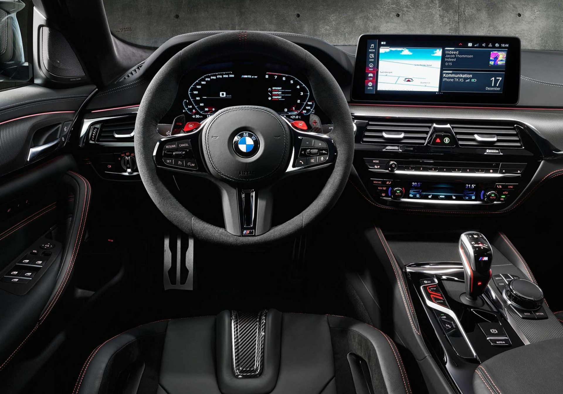 Το τιμόνι M Alcantara με κόκκινη ένδειξη της ευθείας πορείας αποτελεί άλλη μία κλασική πινελιά αγωνιστικού αυτοκινήτου. Τα χειριστήρια αλλαγών σχέσεων (gearshift paddles) κατασκευάζονται από ανθρακονήματα και οι ακτίνες του τιμονιού έχουν επένδυση Black Chrome.