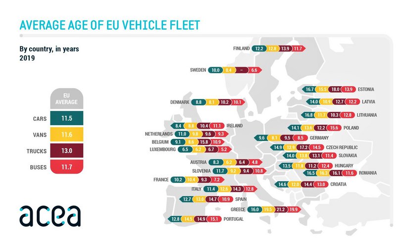 Τη στιγμή μάλιστα που ο μέσος όρος για την Ευρωπαϊκή Ένωση είναι τα 11,5 χρόνια. Κανονική πρωταθλήτρια όντας η χώρα με τον νεότερο στόλο κυκλοφορούντων επιβατικών είναι το Λουξεμβούργο με το στόλο των επιβατικών της να είναι ηλικίας 6,5 ετών. Κι αν μιλήσουμε για τα φορτηγά και τα λεωφορεία τότε είμαστε οι απόλυτοι… ουραγοί καθώς η μέση ηλικία των φορτηγών που κυκλοφορούν στη χώρα μας είναι τα 21,2 χρόνια (!) με μέσο ευρωπαϊκό όρο τα 13 χρόνια ενώ των λεωφορείων τα 19,9 έτη με μέσο όρο στην Ευρώπη τα 11,7 έτη.