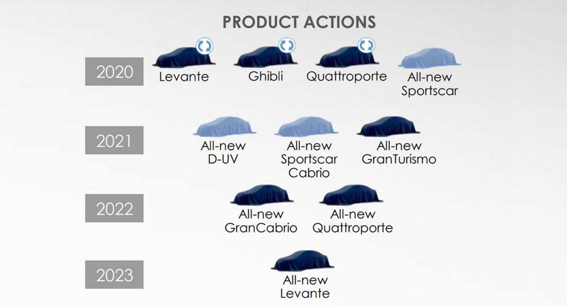 Η οποία θα παρουσιαστεί προς τα τέλη του 2022. Μεγαλύτερη σημασία όμως έχει πως η Maserati επιτέλους θα λανσάρει από του χρόνου ένα νέο σπορ μοντέλο το οποίο δεν θα είναι άλλο από την Alfieri που είχαμε δει ως concept για πρώτη φορά το 2014(!). Μέσα στο 2020 θα παρουσιαστούν επίσης οι ανανεωμένες Levante, Ghibli και Quattroporte με διακριτικές αλλαγές στο αμάξωμα και στο εσωτερικό με αναβαθμισμένο σύστημα πολυμέσων.