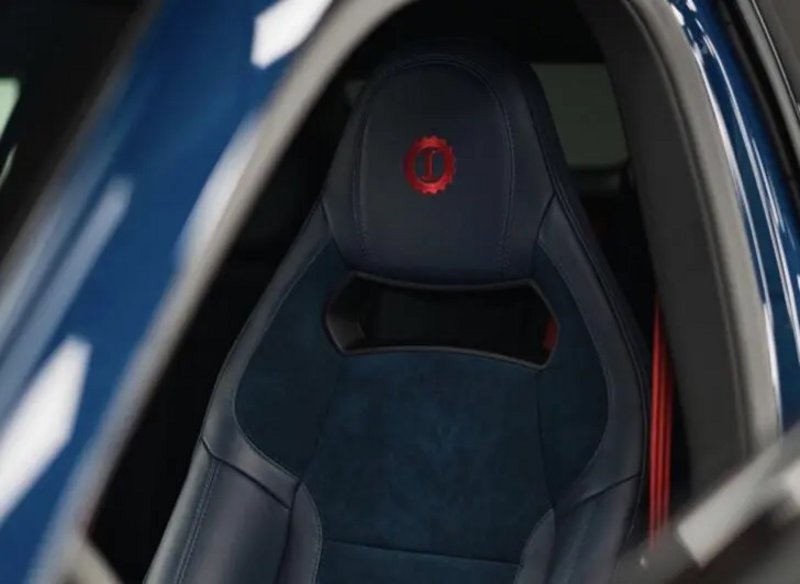 Επίσης, στο ίδιο χρώμα είναι βαμμένα τα καλύμματα των φρένων και η επένδυση του εσωτερικού. Στο τελευταίο, έχει τοποθετηθεί δέρμα nappa πολύ καλής ποιότητας και alcantara, όλα μπλε φυσικά.