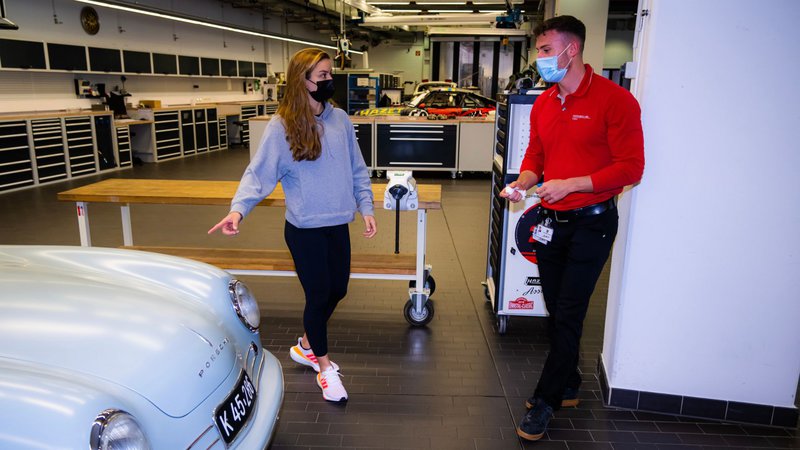 Η περιήγησή της ξεκίνησε στο εργαστήριο του μουσείου όπου αναδημιουργούνται και επισκευάζονται ιστορικά οχήματα από ειδικούς σε πλήρη θέα όλων των επισκεπτών. Την προσοχή της τράβηξε ιδιαίτερα η μπλε Porsche 356. «Αν έπρεπε να αποφασίσω υπέρ ενός από αυτά τα πολλά φανταστικά αυτοκίνητα, τότε θα επέλεγα το 356. Μου θυμίζει λίγο αυτοκίνητο Τζέιμς Μποντ», είπε με ένα πλατύ χαμόγελο στο πρόσωπό της. Αργότερα κάθισε η ίδια στο 356 «Νο. 1" Roadster, η πρώτη Porsche, και εξεπλάγη από το μικρό πιλοτήριο λέγοντας: "Δεν είμαι πραγματικά τόσο ψηλή, αλλά ακόμη και τώρα έχω πρόβλημα να βγω έξω."