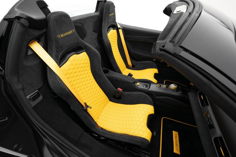 Εκτός αυτού, σημαντικές αλλαγές έχουν γίνει και στο εσωτερικό, όπου έχουν τοποθετηθεί αγωνιστικά καθίσματα bucket ντυμένα με ύφασμα alcantara και καπιτονέ δέρμα, σε κίτρινο και μαύρο χρώμα. Τα πατάκια κι οι ζώνες ακολουθούν τον ίδιο χρωματικό συνδυασμό, ο οποίος έχει υιοθετηθεί σε όλη την επιφάνεια του ταμπλό και στην κεντρική κονσόλα. Το ειδικό τιμόνι της Mansory συνδυάζει τέλεια το ανθρακόνημα και το ύφασμα alcantara, ενώ οι ραφές κάνουν αντίθεση.
