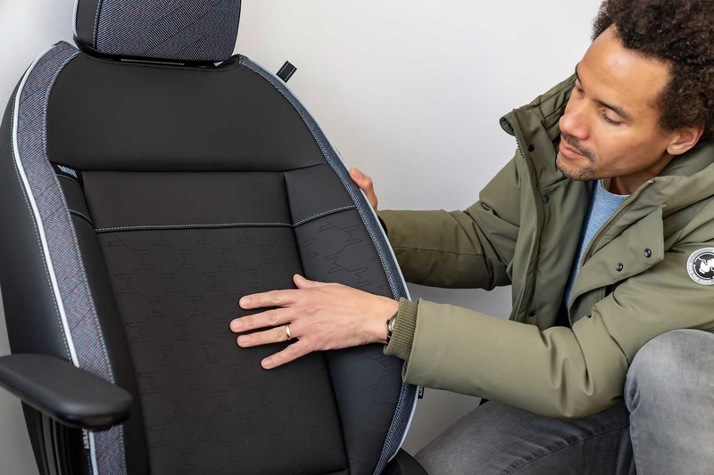 Ένας φρέσκος συνδυασμός νέων χρωμάτων και μοτίβων μαζί με κλασικά στοιχεία στυλ, όπως το μοτίβο houndstooth, δημιουργούν μια γέφυρα από το παρελθόν στο μέλλον. Τα πλαστικοποιημένα πλαϊνά πάνελ των καθισμάτων φαίνονται ιδιαιτέρως πολύτιμα και επιβεβαιώνουν την προσοχή στη λεπτομέρεια. Όπως και τα υποβραχιόνια που ενσωματώνονται για πρώτη φορά στα καθίσματα, συμβάλλουν στη φιλική αίσθηση του εσωτερικού.