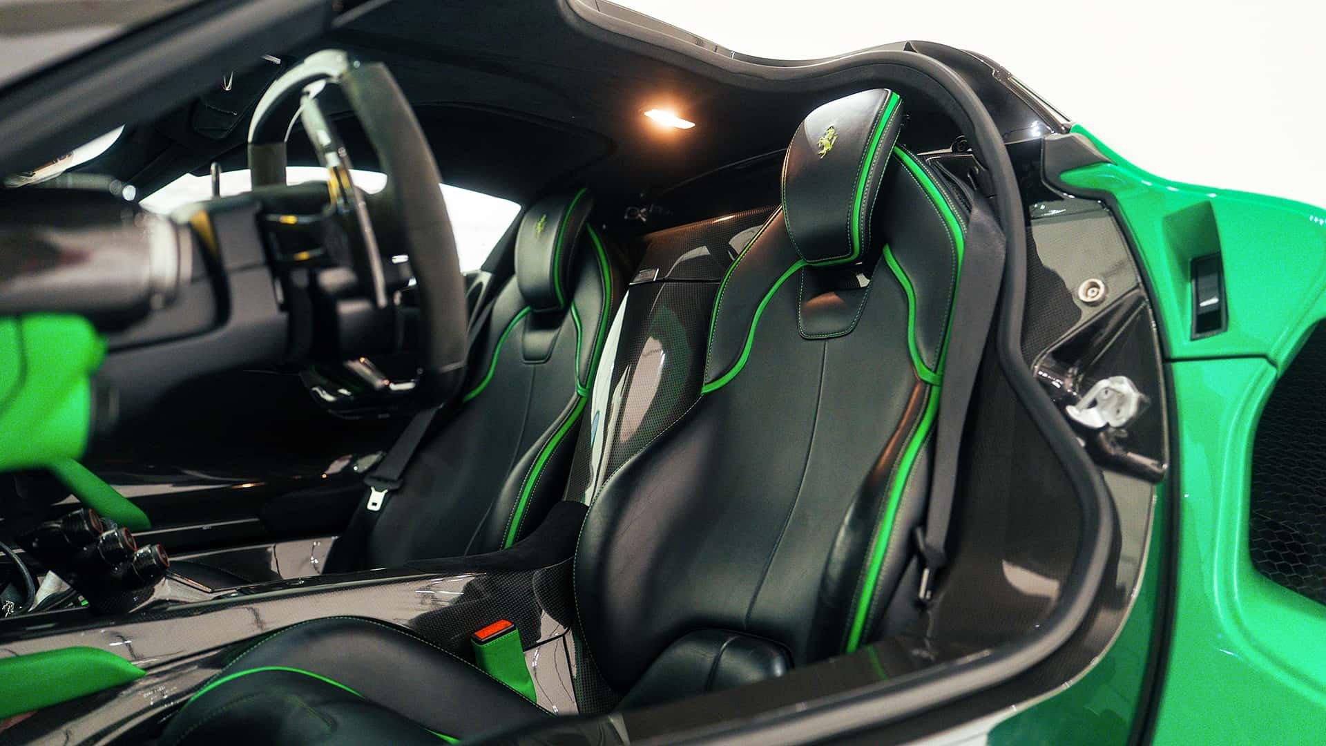 Η συγκεκριμένη διαμόρφωση περιλαμβάνει επίσης οροφή από εκτεθειμένο μαύρο ανθρακόνημα, ένα στοιχείο που επέλεξαν μόλις περίπου 50 πελάτες της Ferrari για το συγκεκριμένο μοντέλο.