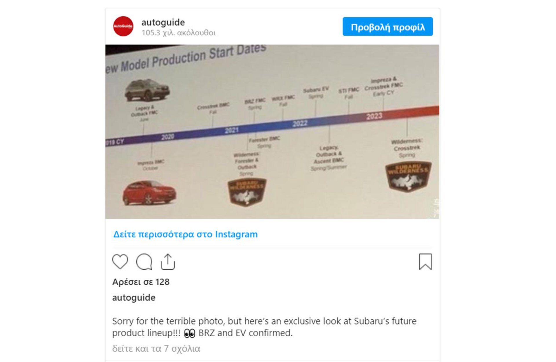 Προς τα τέλη του 2021 θα δούμε το ολοκαίνουργιο Subaru WRX και ένα χρόνο αργότερα το WRX STI που θα έχε και αυτό τον turbo των 2,4 lt. Με την διαφορά πως εδώ η ισχύς θα φτάνει τα 400 άλογα σε σχέση με το απλό και επίσης τετρακίνητο WRX που θα έχει περίπου 300, όπως αναφέρει το autoguide.com.