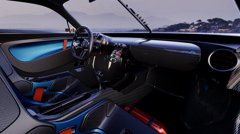 Στο εσωτερικό κυριαρχεί το ανθρακόνημα και το δέρμα, ενώ το ταμπλό δείχνει να αιωρείται. Οπτικά ξεχωρίζει ο πίνακας οργάνων και οι διακόπτες και σε αντίθεση με ότι είθισται τελευταία δεν υπάρχουν οθόνες, καθώς ο σχεδιαστής ήθελε να δημιουργήσει μια μηχανική αίσθηση.