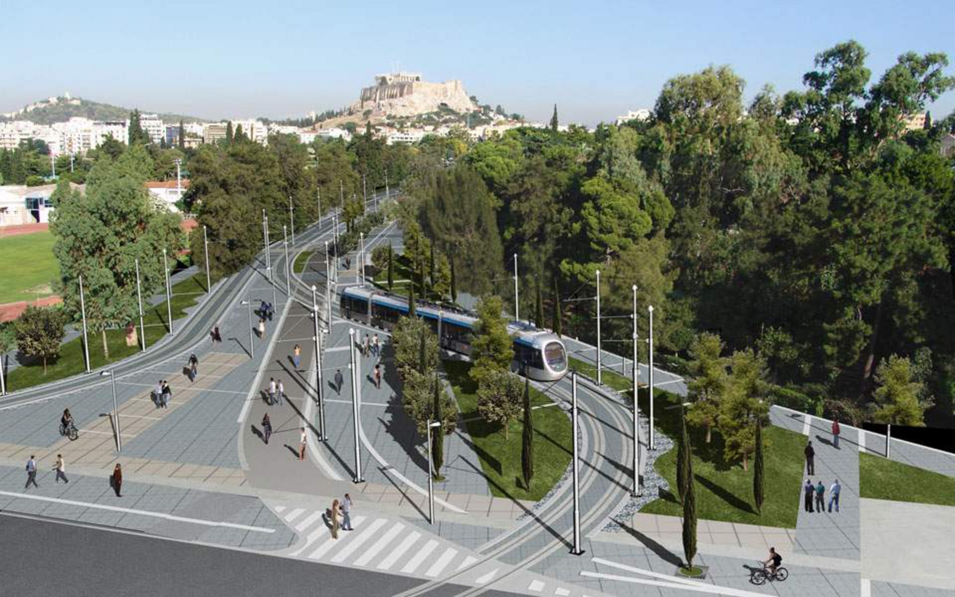 - Οι γραμμές ανόδου και καθόδου του Τραμ από και προς το Σύνταγμα. Η λωρίδα καθόδου, που θα χρησιμοποιείται επίσης για την είσοδο και έξοδο Ε.Ι.Χ. αυτοκινήτων προς και από τον Όμιλο Αντισφαιρίσεως Αθηνών και για τη διέλευση οχημάτων κοινής ωφέλειας.