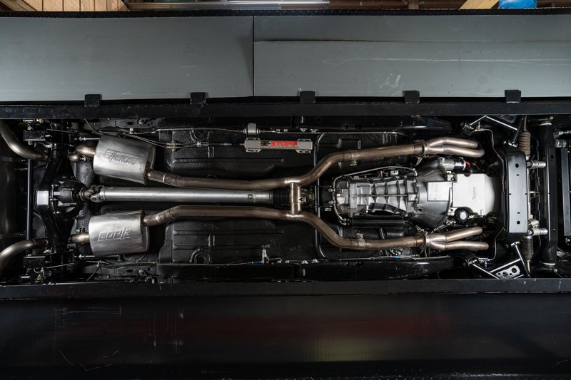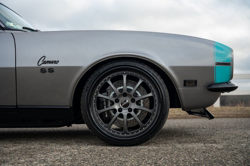 Η πρόσφυση εξασφαλίζεται μέσω ελαστικών Michelin Pilot Sport 4 S, με διαστάσεις 245/30 ZR19 μπροστά και 325/25 ZR20 πίσω, τα οποία χώρεσαν άψογα χάρη στο mini tub kit της Detroit Speed. Οι ζάντες Forgeline Ga3c προσθέτουν επιπλέον κύρος και αισθητική αρμονία με την σκούρα γκρι βαφή τους.