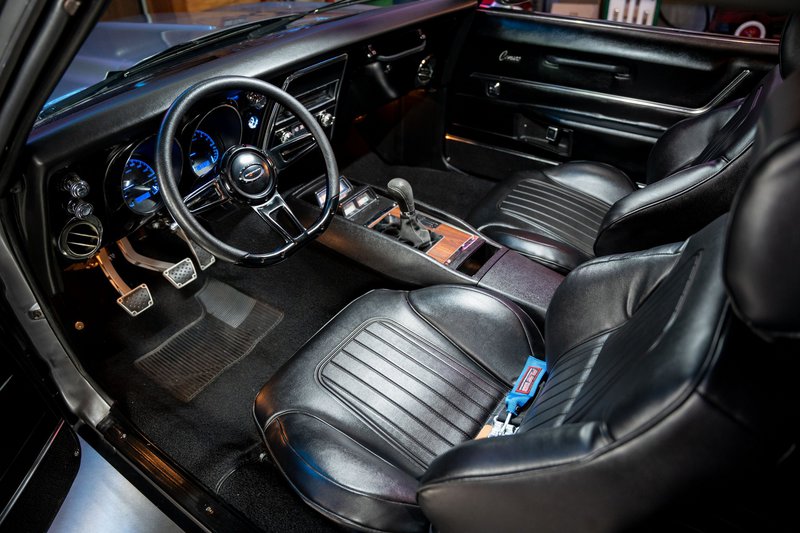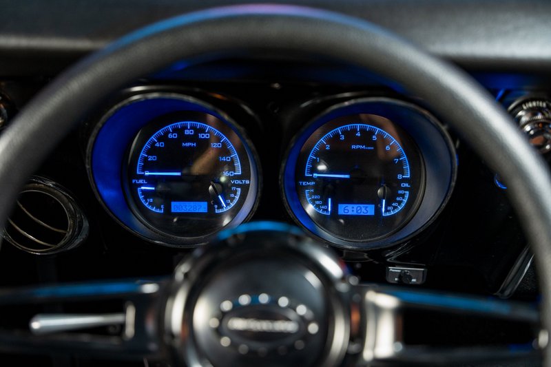 Τα retro bucket καθίσματα κρατούν σταθερά τον οδηγό και τον συνοδηγό, ενώ τα ψηφιακά όργανα της Dakota Digital παρέχουν ζωντανή πληροφόρηση για τη λειτουργία του αυτοκινήτου. Το Billet Specialties τιμόνι, το ηχοσύστημα της Pioneer, το ηλεκτρικό χειρόφρενο, η εκκίνηση με κουμπί και το σύστημα κλιαμτισμου προσφέρουν την αίσθηση ενός σημερινού αυτοκινήτου, διατηρώντας παράλληλα το retro ταμπεραμέντο.
