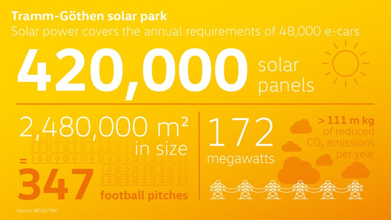 H Volkswagen, με στόχο την παραγωγή «πράσινης» ηλεκτρικής ενέργειας για ηλεκτρικά αυτοκίνητα, υποστήριξε ενεργά τη δημιουργία ενός γιγάντιου φωτοβολταϊκού πάρκου στη Βόρεια Γερμανία. Το φωτοβολταϊκό πάρκο Tramm-Göthen, περίπου 60 χιλιόμετρα ανατολικά του Αμβούργου, καλύπτει μία έκταση περίπου 2,5 εκατομυρίων τετραγωνικών μέτρων, ίση σχεδόν με 350 γήπεδα ποδοσφαίρου, μια από τις μεγαλύτερες παρόμοιες εγκαταστάσεις στη Βόρεια Ευρώπη.
