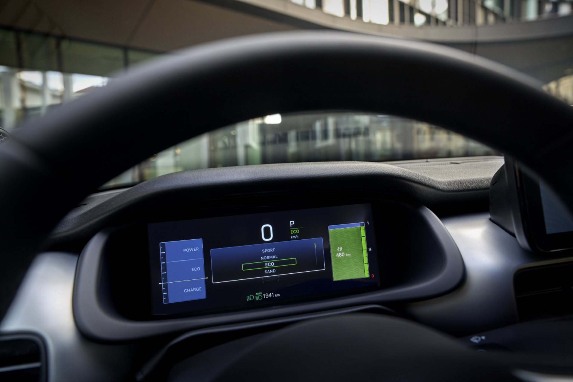 Η εικόνα του εξωτερικού συνεχίζεται με συνέπεια στο εσωτερικό. Το ταμπλό, η κεντρική κονσόλα και τα πάνελ των θυρών είναι επενδυμένα σε μαύρες αποχρώσεις, ενώ τα καθίσματα συνδυάζουν ύφασμα και βινύλιο, ενισχύοντας την αίσθηση ανθεκτικότητας και καθημερινής χρηστικότητας.