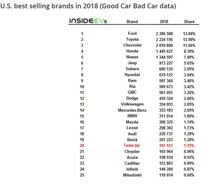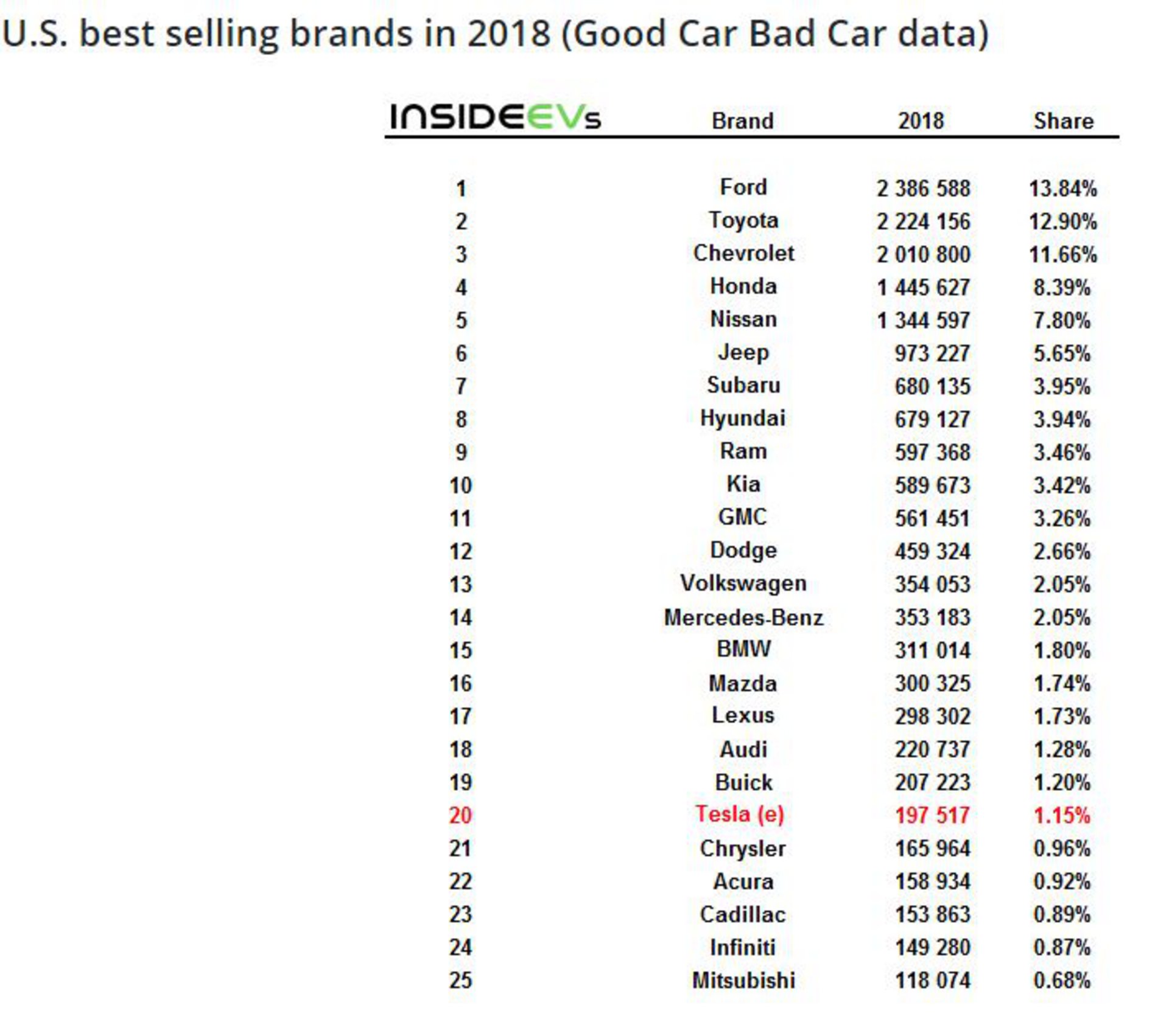 Έτσι μέσα στο 2018 η Tesla κατάφερε να τερματίσει στην 20ή θέση των πωλήσεων, με μερίδιο αγοράς 1,15% και κοντά στις 200.000 μονάδες. Η επίδοση αυτή την φέρνει πάνω από την άλλοτε κραταιά Chrysler που βρίσκεται αρκετά πίσω της όπως βλέπουμε και στον πίνακα.