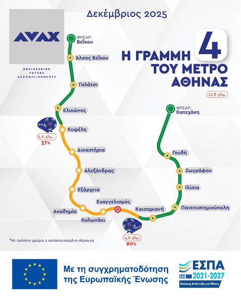 Με γοργό ρυθμό προχωρά η κατασκευή της γραμμής 4 του Μετρό της Αθήνας που θα συνδέει το Γαλάτσι με τον σταθμό «Κατεχάκη».