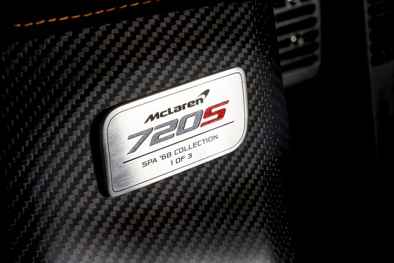 Η McLaren 720S ‘Spa 68’ είναι, επίσης, βαμμένη σε πορτοκαλί χρώμα -χαρακτηριστικό της MSO- με την οροφή της να είναι μαύρη. Τόσο στο αμάξωμά της όσο και στο προσκέφαλο των καθισμάτων της υπάρχει το σκαρίφημα της πίστας του Spa, με τη χάραξη όπως ήταν τη χρονιά του 1968, μήκους 14,1 km.