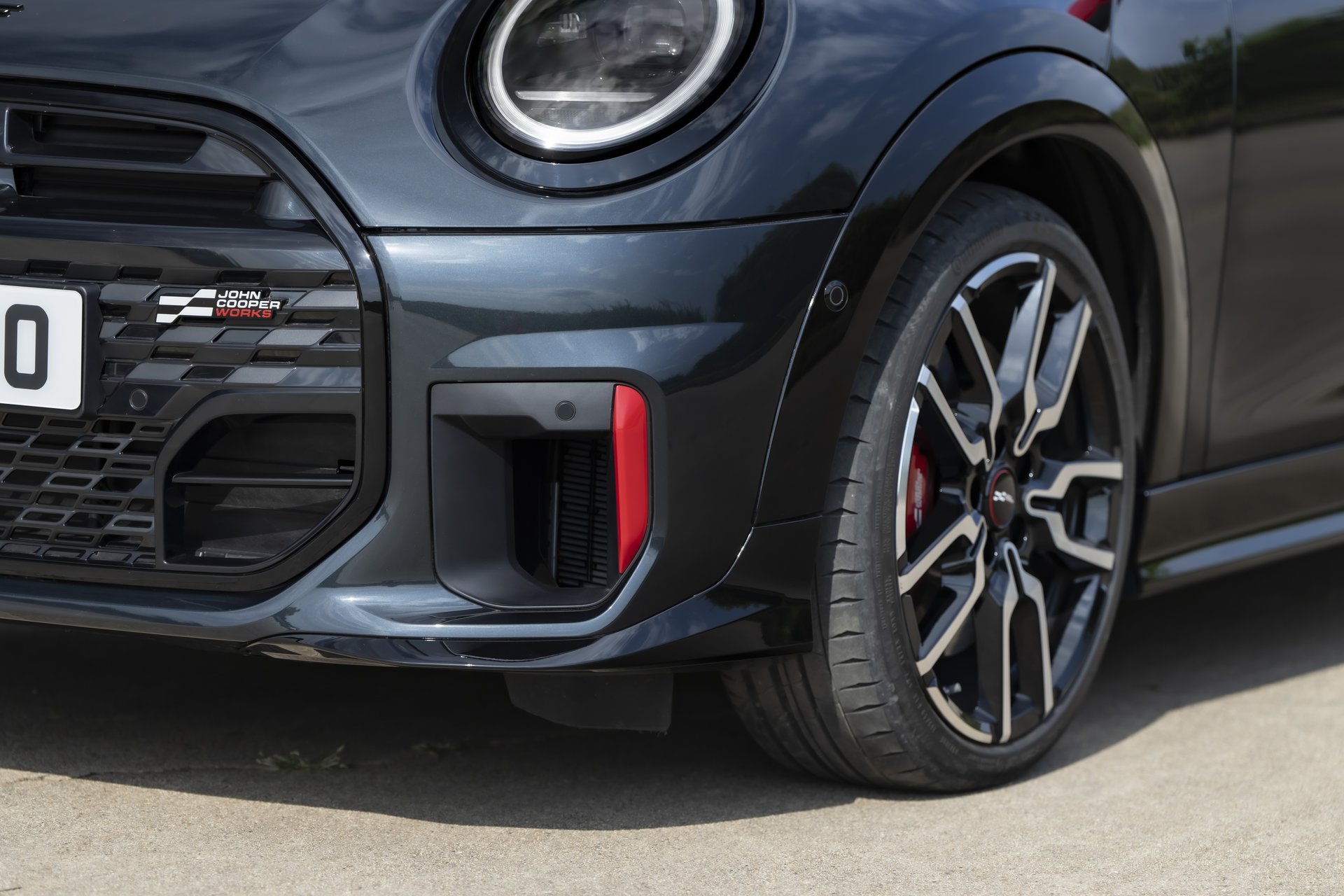 Περνώντας στο στιλιστικό κομμάτι οι χαρακτηριστικές επιθετικές σπορ πινελιές που πάντα χαρακτήριζαν τις JCW εκδόσεις δεν θα μπορούσαν να απουσιάζουν. Ο εμπρός προφυλακτήρας με την ευμεγέθη οκτάγωνη γρίλια είναι πλέον σε γυαλιστερή μαύρη απόχρωση με πολλές εισαγωγές αέρα να έχουν τοποθετηθεί, ενώ το ξεχωριστό JCW σήμα δεσπόζει στο αριστερό μέρος και μαζί με τα χαρακτηριστικά μόνο για την έκδοση JCW κάθετα τοποθετημένα φώτα ημέρας προσφέρουν τη ξεχωριστή πινελιά. Εκατέρωθεν του εμπρός προφυλακτήρα υπάρχουν δύο επίσης μεγάλες εισαγωγές αέρα με κόκκινες λεπτομέρειες, οι οποίες μάλιστα είναι ενεργές και εξυπηρετούν την ψύξη τόσο των φρένων όσο και των ψυγείων του κινητήρα. Στην κλειστή έκδοση η κλασική σε σχεδιασμό για τις JCW εκδόσεις αεροτομή δεσπόζει στην οροφή με την εικόνα του πίσω τμήματος να ολοκληρώνει ο διαχύτης στο τελείωμα του πίσω προφυλακτήρα καθώς και η κεντρικά τοποθετημένη εξάτμιση.