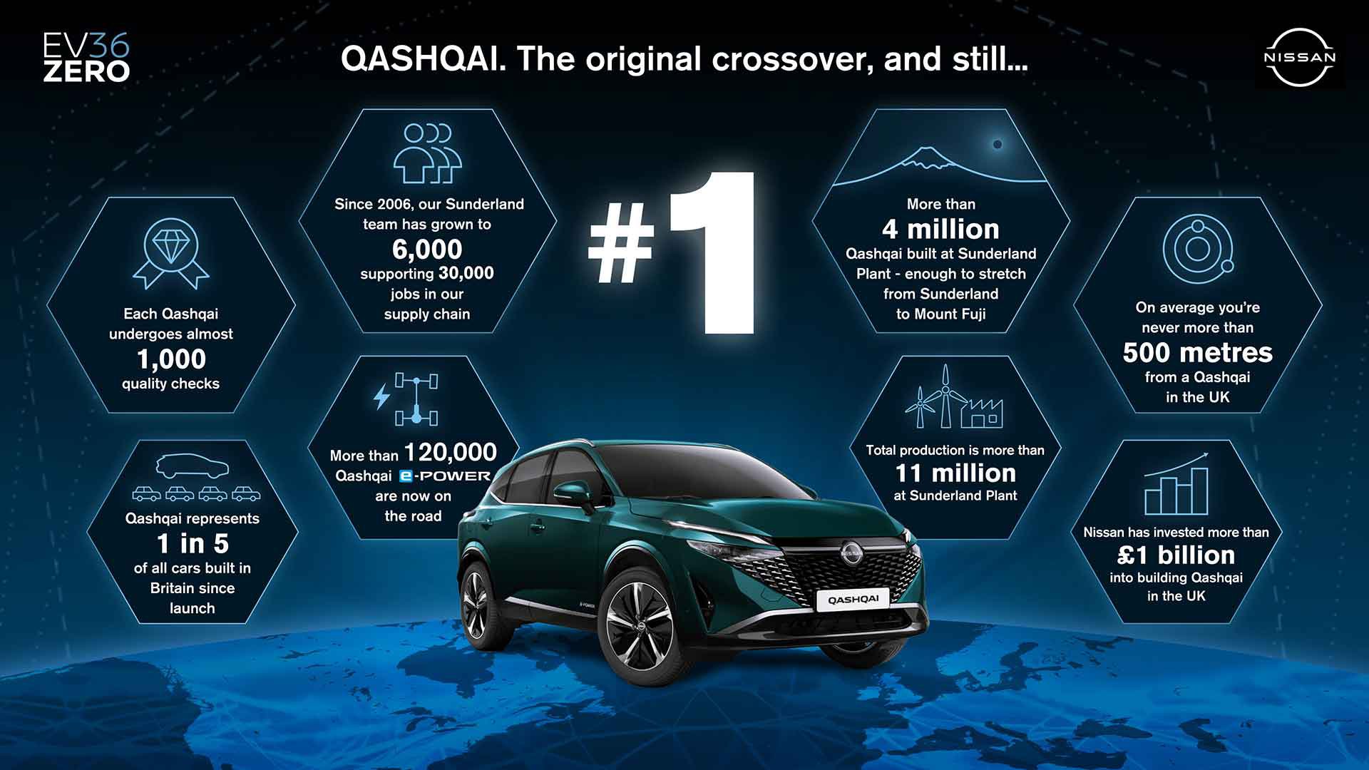 Από τότε που κυκλοφόρησε το Qashqai τρίτης γενιάς το 2021, έχει πουλήσει περισσότερες από 350.000 μονάδες στην Ευρώπη και συνεχίζει να θέτει τα πρότυπα για τα crossover. Το 2022 το Qashqai έγινε διαθέσιμο με το e-POWER – το μοναδικό και καινοτόμο ηλεκτροκίνητο σύστημα κίνησης της Nissan όπου οι τροχοί κινούνται πάντα απευθείας από τον ηλεκτροκινητήρα – δημιουργώντας μια αίσθηση EV-drive. Περισσότερα από 120.000 Qashqai που κατασκευάστηκαν από το Sunderland με e-POWER είναι τώρα στους δρόμους.