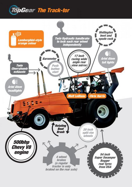 Το περίεργο είναι πως αυτό το τρακτέρ ονομάζεται Track-tor και προέκυψε όταν ο Matt LeBlanc με τον Chris Harris ασχολήθηκαν με το κυκλοφοριακό και τα επικίνδυνα προσπεράσματα που δημιουργούν τα τρακτέρ στους δρόμους της επαρχίας. Τελικά προέκυψε το πειραματικό Track-tor με έναν V8 κινητήρα της Chevrolet. Τον γνωστό των 5,7 lt που αποδίδει 500 PS και που για την περίσταση εφοδιάζεται με ρυθμιζόμενη ανάρτηση, νέα λάστιχα και τροχούς και μεγάλα δισκόφρενα ώστε να επιβραδύνει αποτελεσματικά.