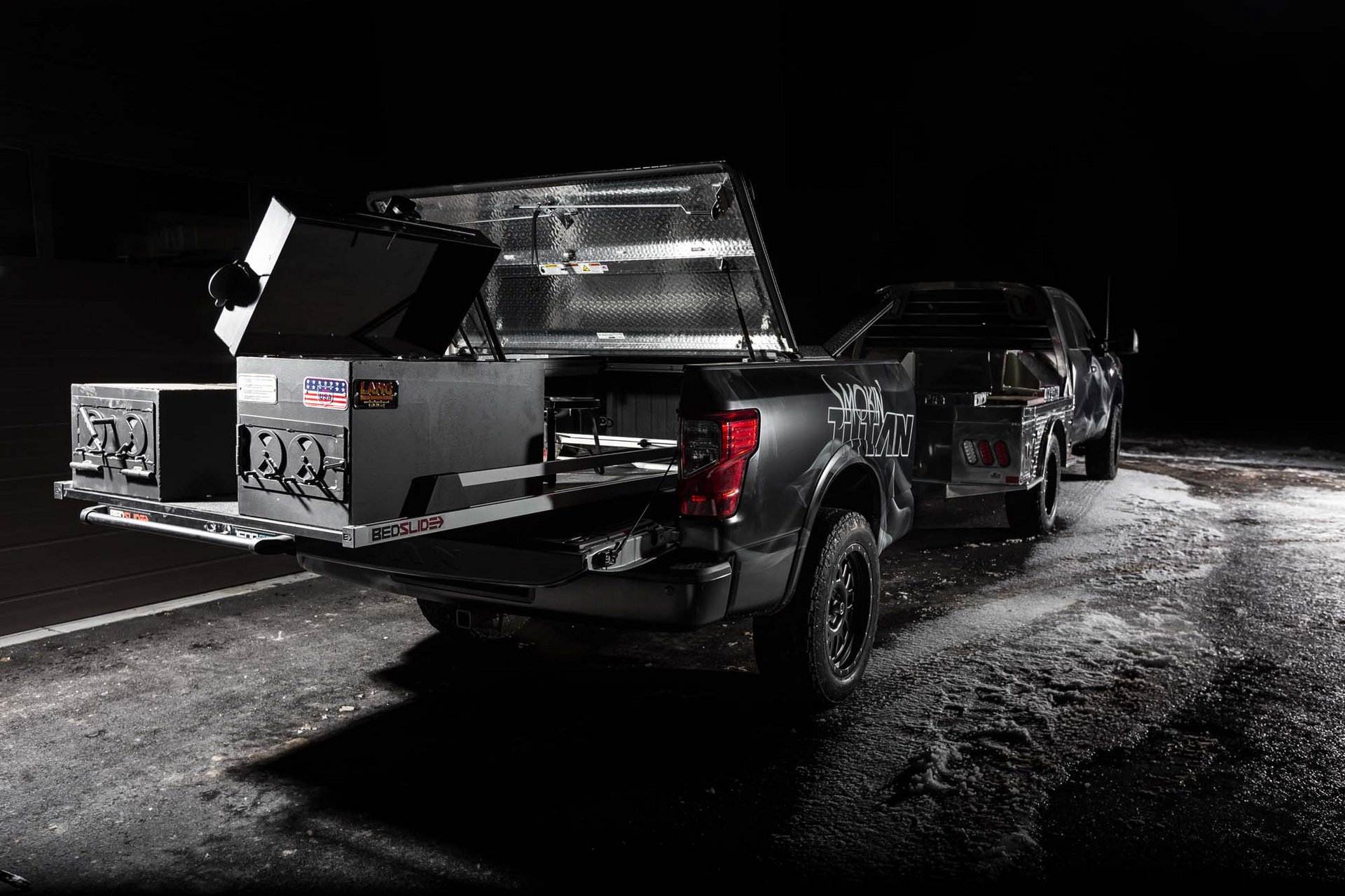 Το ρυμουλκούμενο του Smokin 'TITAN διαθέτει δύο γνήσιες, στεγανές θήκες αποθήκευσης του Nissan TITAN που χρησιμεύουν για τα ξύλα της φωτιάς. Χρησιμοποιώντας το πρωτοποριακό σύστημα μεταφοράς Utili-Track του TITAN, ένας συρόμενος δίσκος της B & S έχει σχεδιαστεί για να είναι εύκολο να συρθεί η ψησταριά μέσα και έξω από το πάτωμα.