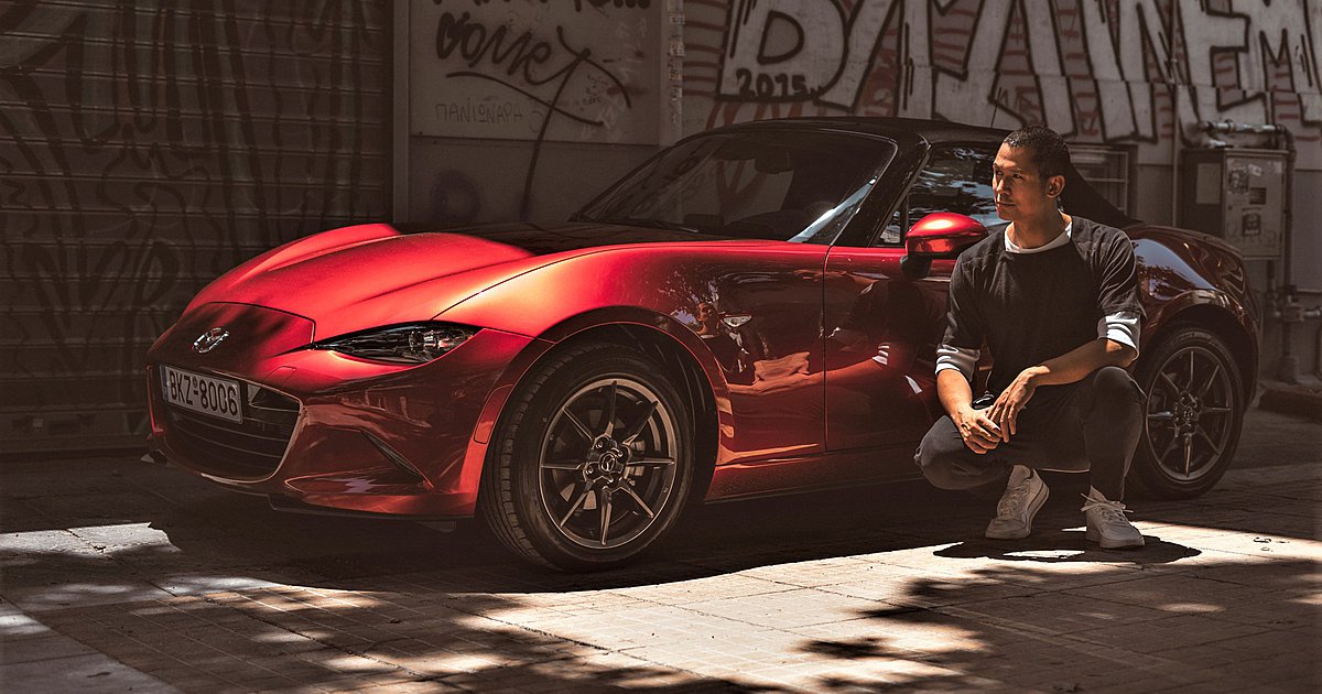 Πίσω από το τιμόνι ενός MX-5, το θρυλικό μοντέλο της Mazda που δεν αφήνει κανέναν ασυγκίνητο, o Σωτήρης βιώνει αυτό που η μάρκα διαχρονικά πρεσβεύει: Jinba Ittai, ή αλλιώς την εναρμονισμένη και απόλυτη σύνδεση του οδηγού με το αυτοκίνητο.