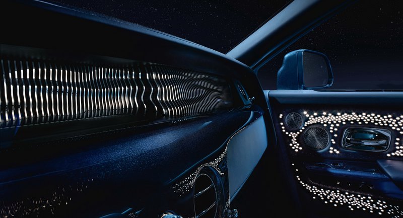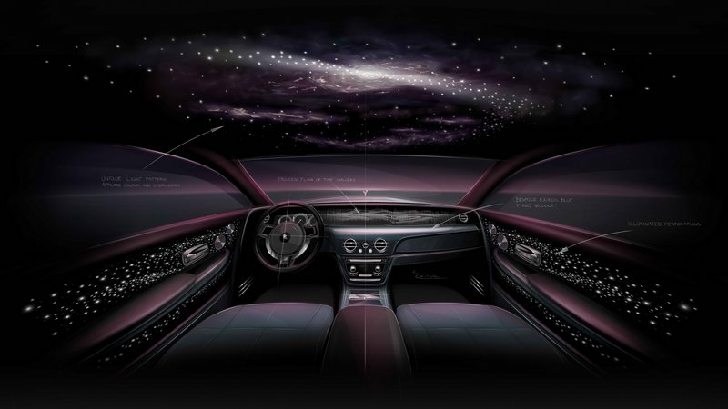 Φυσικά, η Rolls Royce που βλέπετε απέχει πολύ λιγότερο και στο μοναδικό αυτό διάκοσμο βλέπουμε αναπαραστάσεις από φωτεινά αστέρια στα πλαϊνά των πορτών ή ακόμη και στο ταμπλό. Στην οροφή που μοιάζει με έναστρο θόλο υπάρχει το κάτι παραπάνω, όπως ένα νεφέλωμα ή μια αστρική δίνη.