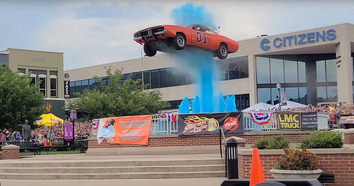 Η σκηνή θύμιζε χολιγουντιανή παραγωγή με το σιντριβάνι στην Fountain Square Park να είχε βαφτεί τιρκουάζ, προσδίδοντας ακόμα πιο δραματική αισθητική στο πέρασμα του General Lee. Το εμβληματικό πορτοκαλί αμάξι, ντυμένο όπως το πρωτότυπο του 1969, απογειώθηκε με φόρα, διέγραψε μια εντυπωσιακή καμπύλη στον αέρα και διέσχισε το σιντριβάνι, σηκώνοντας νερά και επευφημίες.