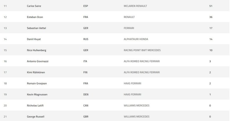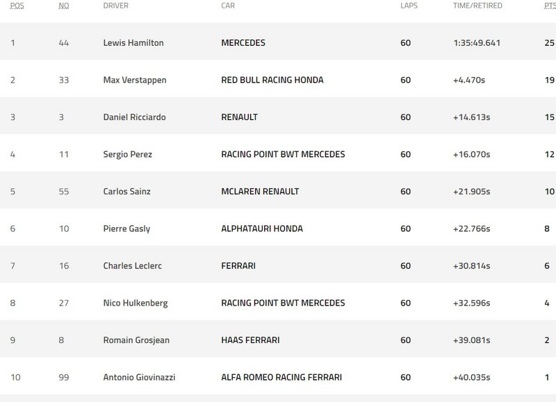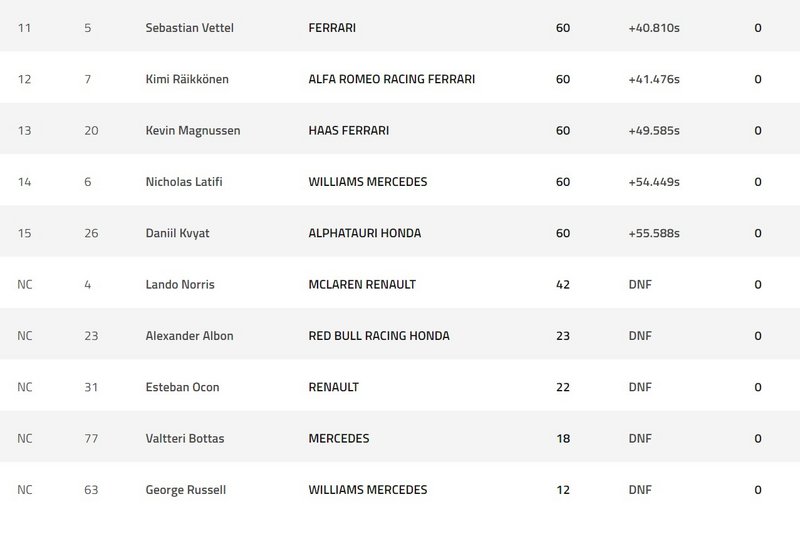 Τέταρτος τερμάτισε ο Sergio Perez (BWT Racing Point F1 Team), ο οποίος έκανε έναν καλό αγώνα και πίεσε ως το τέλος για να μπορέσει να είναι αυτός στη θέση του Ricciardo, χωρίς να το καταφέρει. Στην πέμπτη θέση τερμάτισε ο Carlos Sainz με το μονοθέσιο της McLaren F1 Team και στην έκτη θέση ο Pierre Gasly με αυτό της Scuderia AlphaTauri Honda. Ο Γάλλος πιλότος, επίσης έκανε έναν καλό αγώνα και η προσπάθειά του δικαιώθηκε από το αποτέλεσμα. Για τη Ferrari, o Charles Leclerc ήταν έβδομος, ενώ ο Sebastian Vettel ενδέκατος.