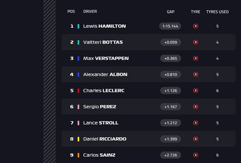 Στη δεύτερη θέση ήταν ο ομόλογός του Valtteri Bottas o οποίος ήταν πολύ κοντά στον Hamilton σε χρόνο, αλλά δεν κατάφερε να τον ξεπεράσει. Από την τρίτη θέση θα εκκινήσει ο Max Verstappen, ο οποίος έδειχνε σταθερός στην απόδοσή του σε όλη τη διαδικασία, αλλά δεν μπόρεσε να διασπάσει ή και να ξεπεράσει το δίδυμο της γερμανικής ομάδας. Τέταρτος θα εκκινήσει στο αυριανό Grand Prix ο Alexander Albon, ο ομόλογός του στην Aston Martin Red Bull Racing, ο οποίος επίσης κινήθηκε με σταθερό ρυθμό.