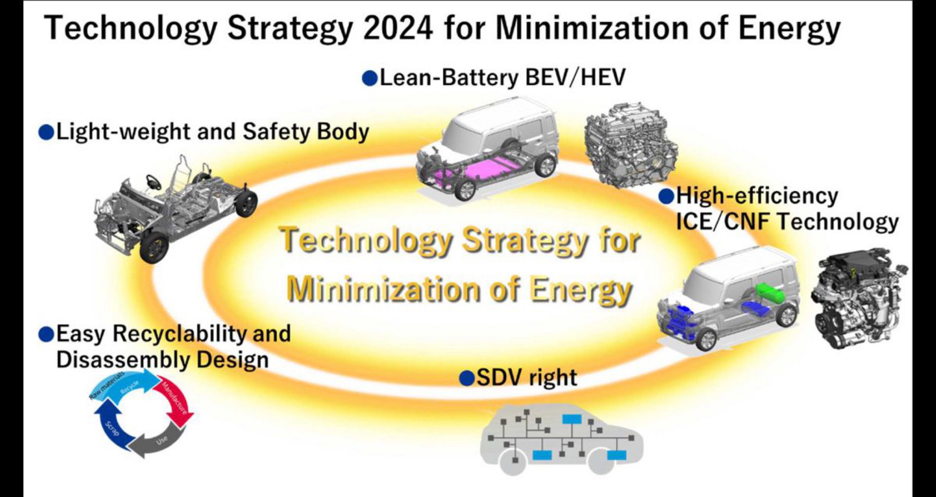 Δέσμευση της εταιρείας είναι η περαιτέρω εξέλιξη των ελαφρών και ασφαλών αμαξωμάτων "HEARTECT" και η ανάπτυξη τεχνολογιών που θα αποφέρουν μείωση του βάρους και κατά συνέπεια ελαχιστοποίηση της κατανάλωσης.