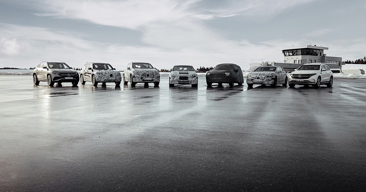 Στην παρακάτω φωτογραφία φαίνεται το ρόστερ της σειράς EQ. Με σειρά από τα αριστερά προς τα δεξιά είναι η νέα EQA, η EQB που αναμένεται να κυκλοφορήσει σύντομα, τα EQS SUV και EQS Sedan, το μυστήριο SUV μοντέλο, η EQE και τέλος η EQC.