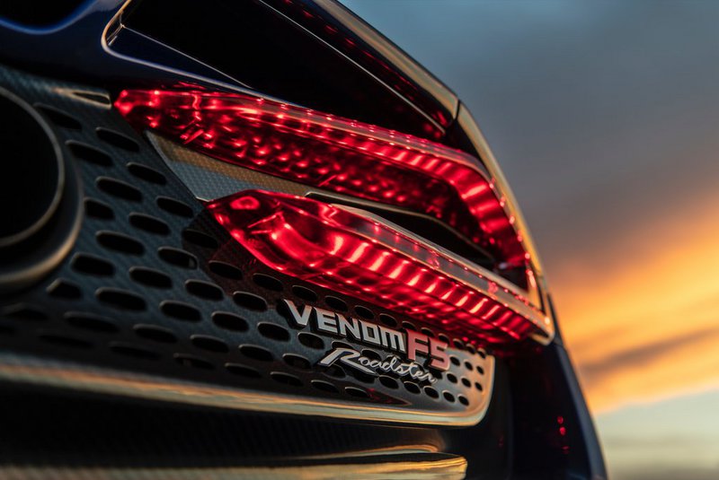 Οι πρώτες teaser φωτογραφίες έχουν δημοσιευτεί και δείχνουν το convertible roadster μπροστά στο ηλιοβασίλεμα. Η εταιρία φρόντισε να είναι ιδιαίτερα σκοτεινή η εικόνα που δείχνει όλο το αμάξωμα, αλλά ακόμα και έτσι φαίνεται η επιβλητική σχεδίαση του Venom F5 που βρίσκεται σε πολύ καλό δρόμο να γίνει το ταχύτερο κάμπριο του κόσμου.