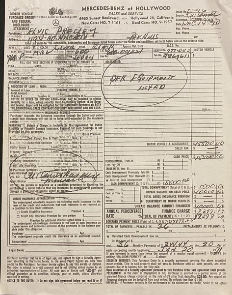 Σε ό,τι αφορά στα αυτοκίνητα, υπολογίζεται ότι είχε αποκτήσει περισσότερα από 200. Ένα από αυτά ήταν και η συγκεκριμένη Mercedes-Benz 600 του 1969 η οποία αγοράστηκε από την αντιπροσωπεία της εταιρείας στο Hollywood στις 14 Δεκεμβρίου 1970, όπως αποδεικνύεται από το σχετικό έγγραφο, και παραδόθηκε στον «Βασιλιά του Rock and Roll» την επόμενη ημέρα (15 Δεκεμβρίου).