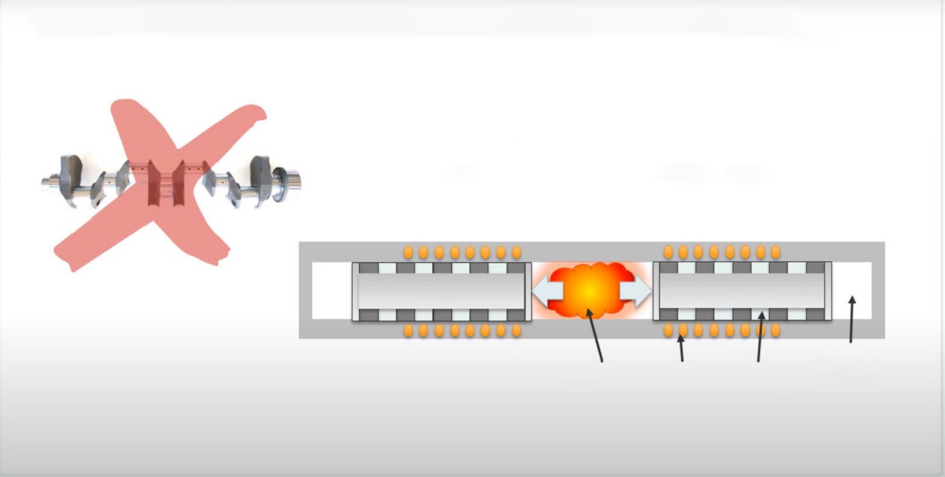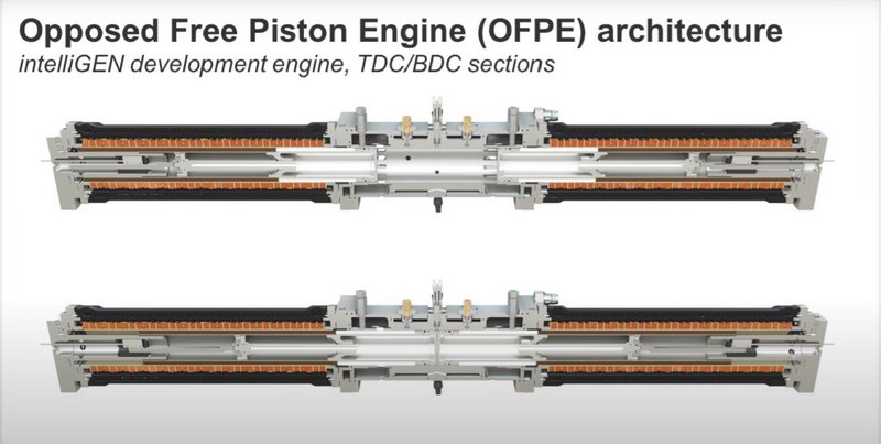 Πρόκειται για κινητήρα, με «ελεύθερα», ομοαξονικά και κινούμενα με αντίθετη φορά έμβολα, που ανά δύο μοιράζονται έναν κοινό θάλαμο καύσης και κατά την παλινδρομική τους κίνηση δεν παράγουν ροπή, αλλά κινούν άξονες εξοπλισμένους με μαγνήτες για την απευθείας παραγωγή ηλεκτρικού ρεύματος.