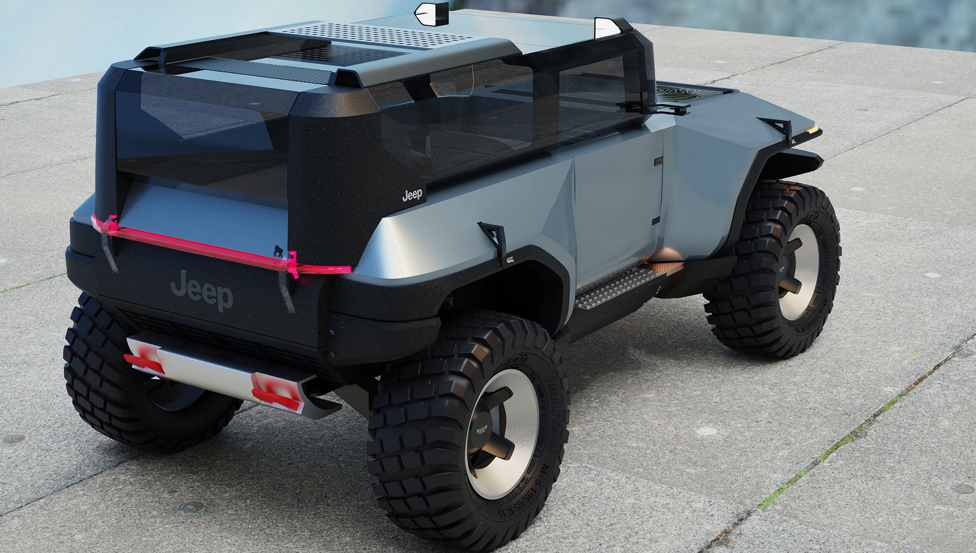 Σύμφωνα με τον ίδιο, το Jeep Wrangler της δεκαετίας του 2030 θα είναι δίπορτο, γεμάτο γωνίες και τζαμένιες επιφάνειες, με μία μπάρα LED φωτών εμπρός, αλλά και πρακτικά στοιχεία, όπως κοτσαδόρο και δύο tow hooks.