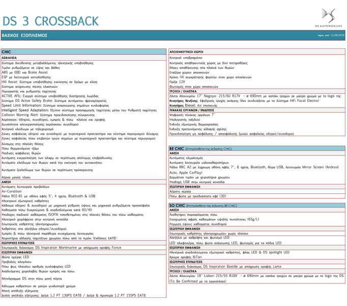 Αναλυτικά οι τιμές πώλησης του νέου DS3 Crossback έχουν ως εξής:
