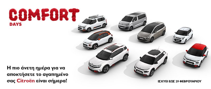 Για περισσότερες πληροφορίες, επισκεφθείτε το Επίσημο Δίκτυο Διανομέων Citroën ή την ιστοσελίδα Citroën Comfort Days. Το πρόγραμμα Citroën Comfort Days ισχύει έως τις 29 Φεβρουαρίου 2020.