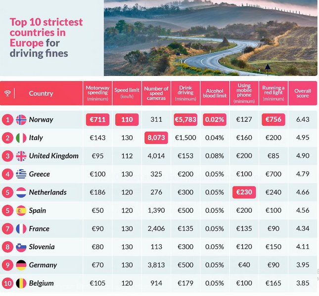 Την ίδια στιγμή μάζεψαν στοιχεία που σχετίζονται με την οδική ασφάλεια, όπως για παράδειγμα τον αριθμό των καμερών στους δρόμους ή τα όρια ταχύτητας, και συνδυάζοντας όλα τα δεδομένα έφτασαν σε ένα τελικό σκορ που δείχνει τις πιο αυστηρές χώρες.