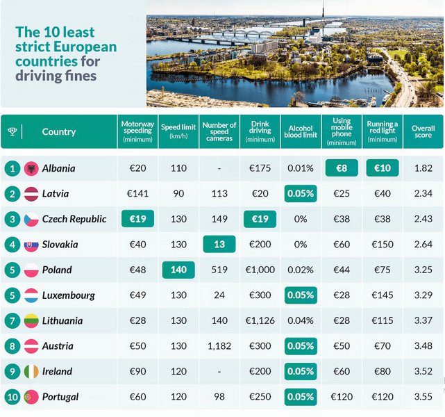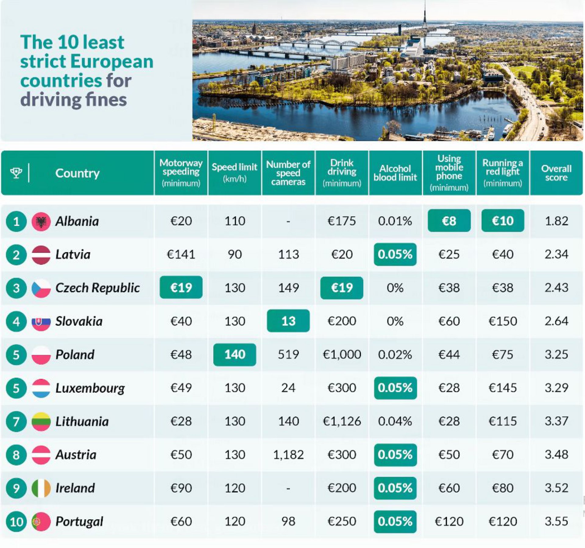Η έρευνα πραγματοποίησε την ίδια ακριβώς διαδικασία προκειμένου να φτάσει σε έναν αντίστοιχο πίνακα με τις πιο «χαλαρές» χώρες αναφορικά με τα πρόστιμα του ΚΟΚ. Όπως μπορείτε να δείτε παρακάτω, πρώτη χώρα είναι η Αλβανία με σκορ 1,82. Αξίζει να αναφερθεί πως το πρόστιμο που προβλέπει ο ΚΟΚ της γειτονικής χώρας για χρήση κινητού τηλεφώνου εν ώρα οδήγησης είναι μόλις 8€, ενώ η παραβίαση του κόκκινου σηματοδότη είναι 10€.