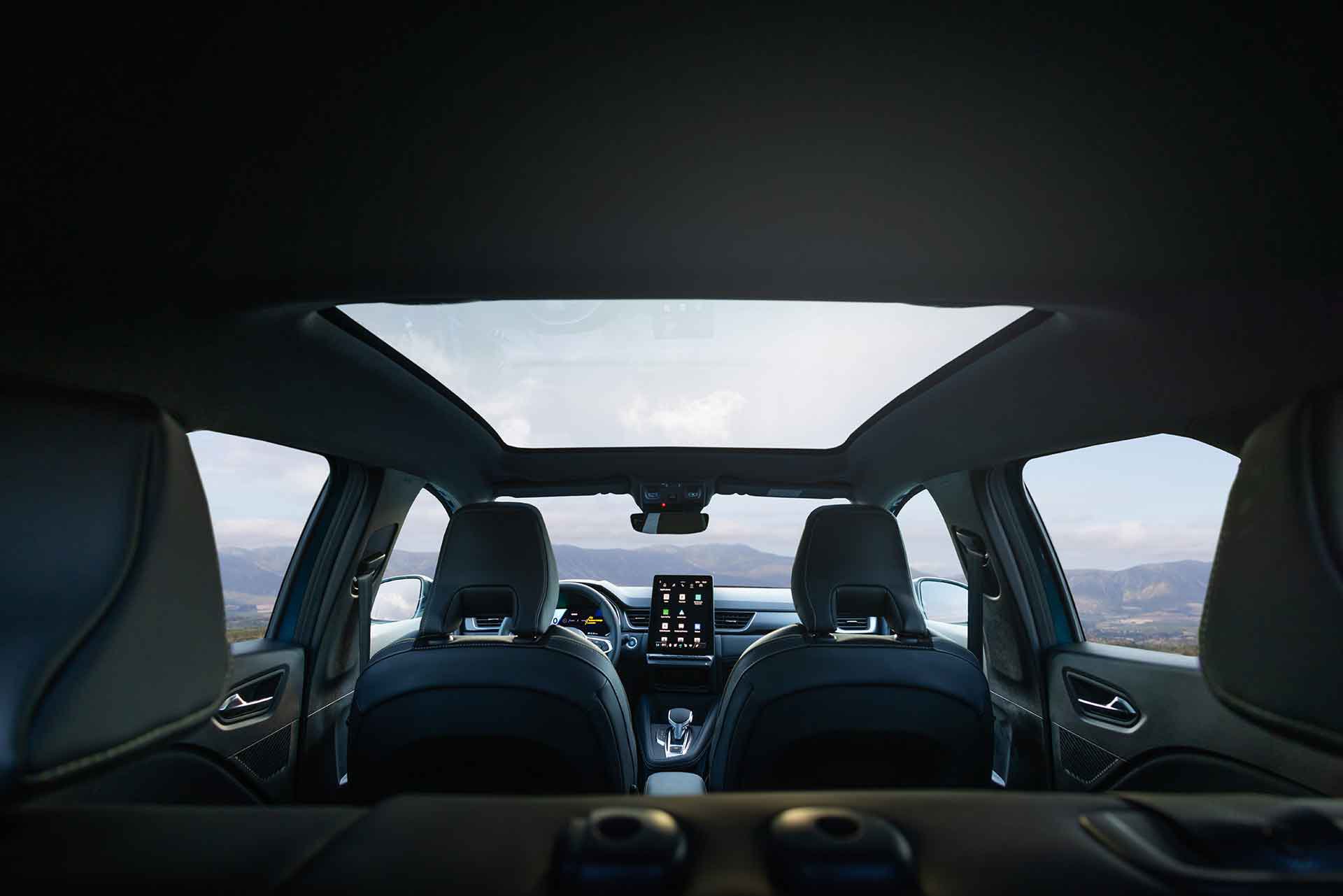 Στο εσωτερικό, εντυπωσιάζει η πανοραμική οροφή (με φιμέ τζάμι) Solarbay, η οποία διαθέτει τεχνολογία υγρών κρυστάλλων και φωνητικό έλεγχο! Η σχεδίαση του ταμπλό ακολουθεί τα βήματα του νέου Captur. Ο οδηγός έχει στη διάθεσή του ψηφιακό πίνακα οργάνων 10,3 ιντσών, ενώ η οθόνη 10,4 ιντσών του OpenR Link συστήματος infotainment έχει κάθετο προσανατολισμό και πολλές υπηρεσίες Google, ενώ υποστηρίζει συνδεσιμότητα Android Auto και Apple CarPlay.