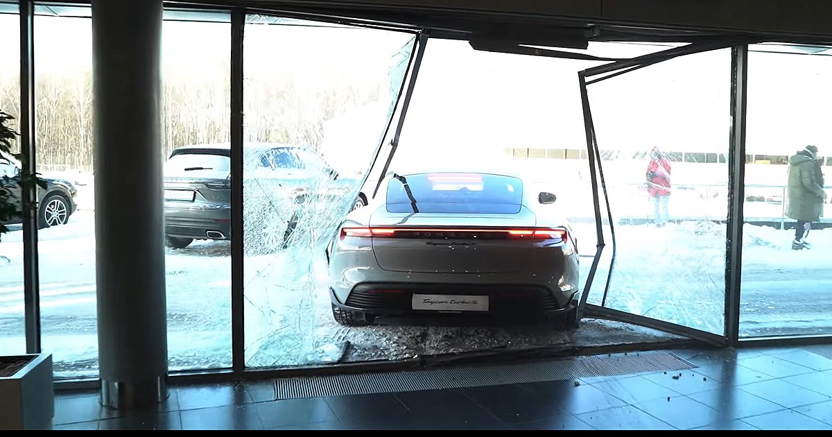 Τώρα σειρά έχει ένας Ρώσος ομοϊδεάτης του, ο οποίος αποφάσισε να καταστρέψει -ευτυχώς όχι ολοσχερώς- μια ολοκαίνουργια Porsche Taycan, περνώντας μέσα από τη βιτρίνα του εκθεσιακού χώρου που μέχρι πρότινος τη φιλοξενούσε.