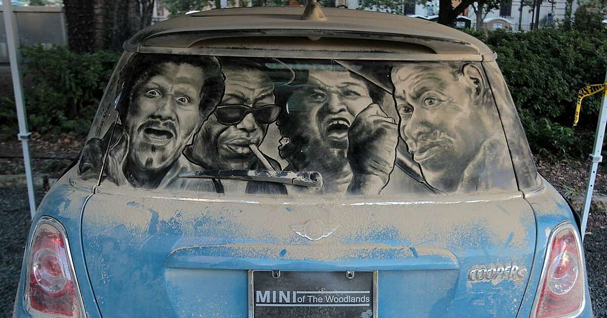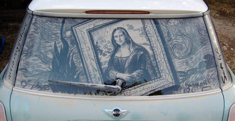Ενώ οι περισσότεροι από εμάς δυσανασχετούμε με αυτή την κατάσταση και τρέχουμε με την πρώτη ευκαιρία στο πλυντήριο της γειτονιάς, ο Αμερικανός καλλιτέχνης εμπνέεται και βλέπει τα σκονισμένα αυτοκίνητα ως καμβά για να ξεδιπλώσει το μοναδικό ταλέντο του.