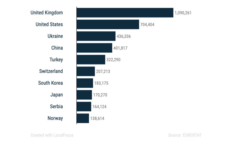 Ακόμα κι έτσι, οι εξαγωγές προς το Ην. Βασίλειο αποτέλεσαν το 20% του συνόλου, δηλαδή όσο σχεδόν συνολικά οι αντίστοιχες εξαγωγές σε ΗΠΑ και Κίνα μαζί. Στις ΗΠΑ, οι εξαγωγές μειώθηκαν σημαντικά, σε σχέση με τα χρόνια πριν από το 2019, ωστόσο διατηρεί τη δεύτερη θέση στην κατάταξη με 704.404 μονάδες για το 2022, επίδοση ελαφρώς βελτιωμένη σε σχέση με ένα χρόνο πριν.