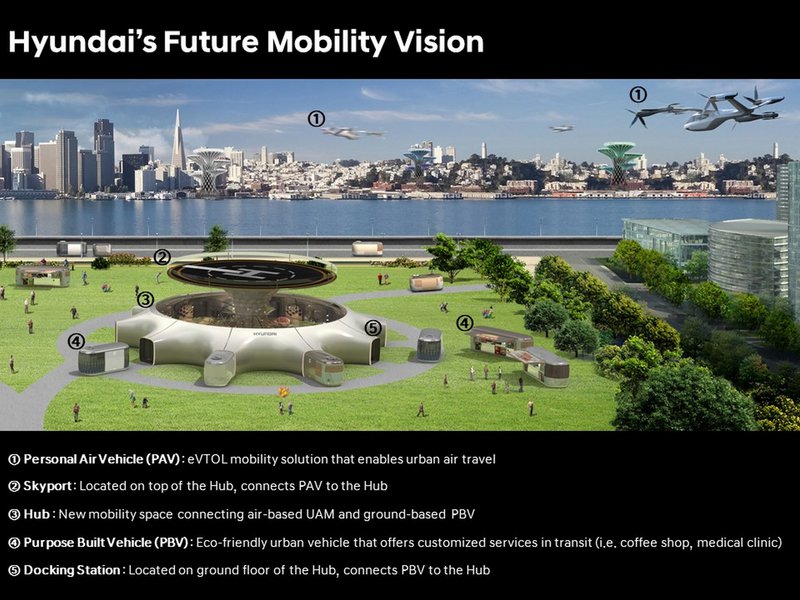 Το πρώτο αφορά στο Urban Air Mobility (UAM) που περιλαμβάνει το ιπτάμενο ταξί Personal Air Vehicle (PAV) σε συνεργασία με την γνωστή Uber. Το τρίτο στοιχείο είναι το Purpose Built Vehicle (PBV), ένα μηδενικών ρύπων όχημα που αναλαμβάνει την μεταφορά από το σημείο UAR που ουσιαστικά λειτουργεί ως κέντρο διερχομένων.