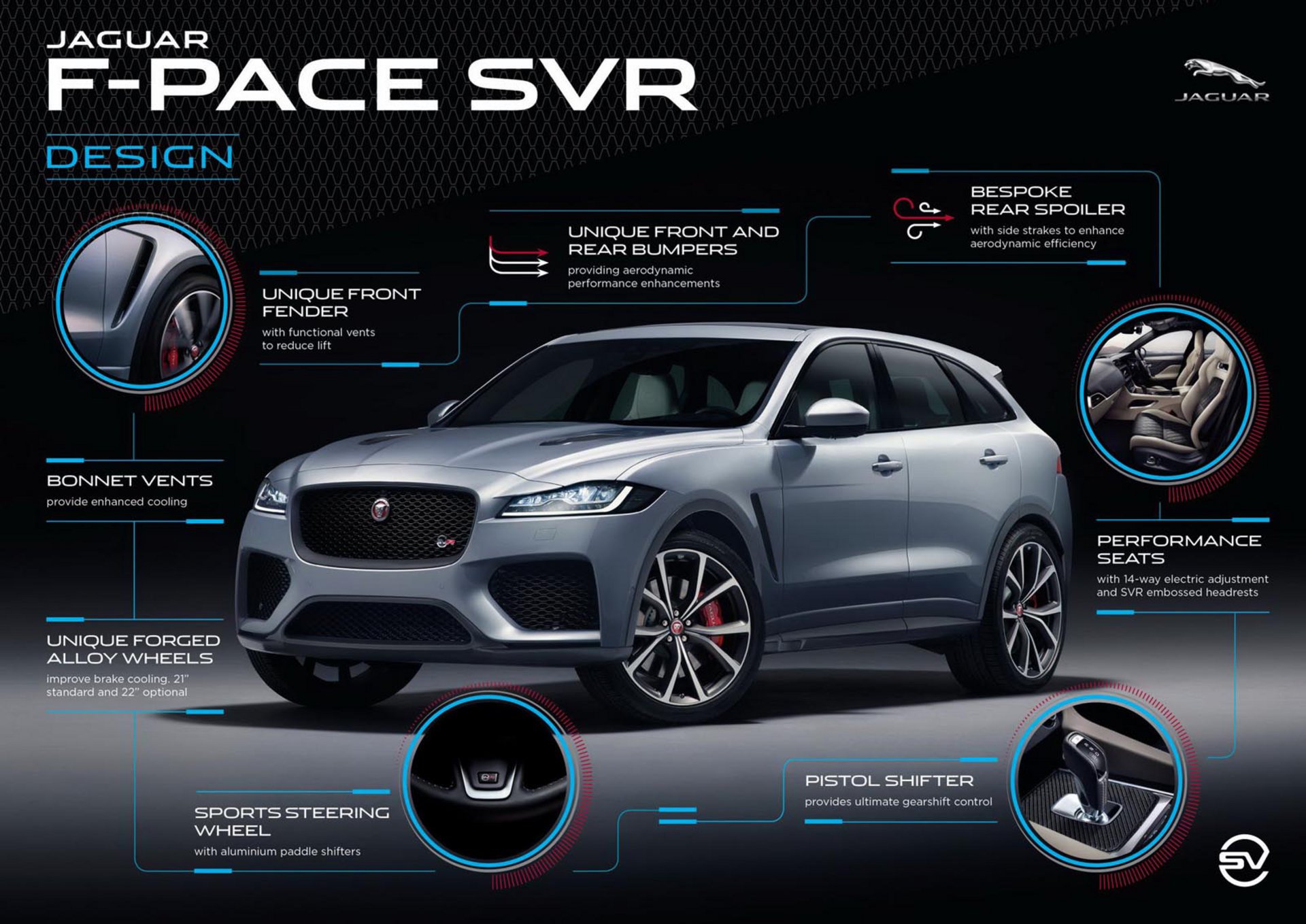 Η αεροδυναμική του «ντοπέ» αμαξώματος έχει βελτιστοποιηθεί, ενώ η Jaguar έχει φροντίσει να εφοδιάσει την SVR με ένα νέο σύστημα εξαγωγής (έως την εξάτμιση) που ζυγίζει 6,6 kg λιγότερα από την στάνταρ και έχει ενεργά διαφράγματα για ενίσχυση του ήχου.